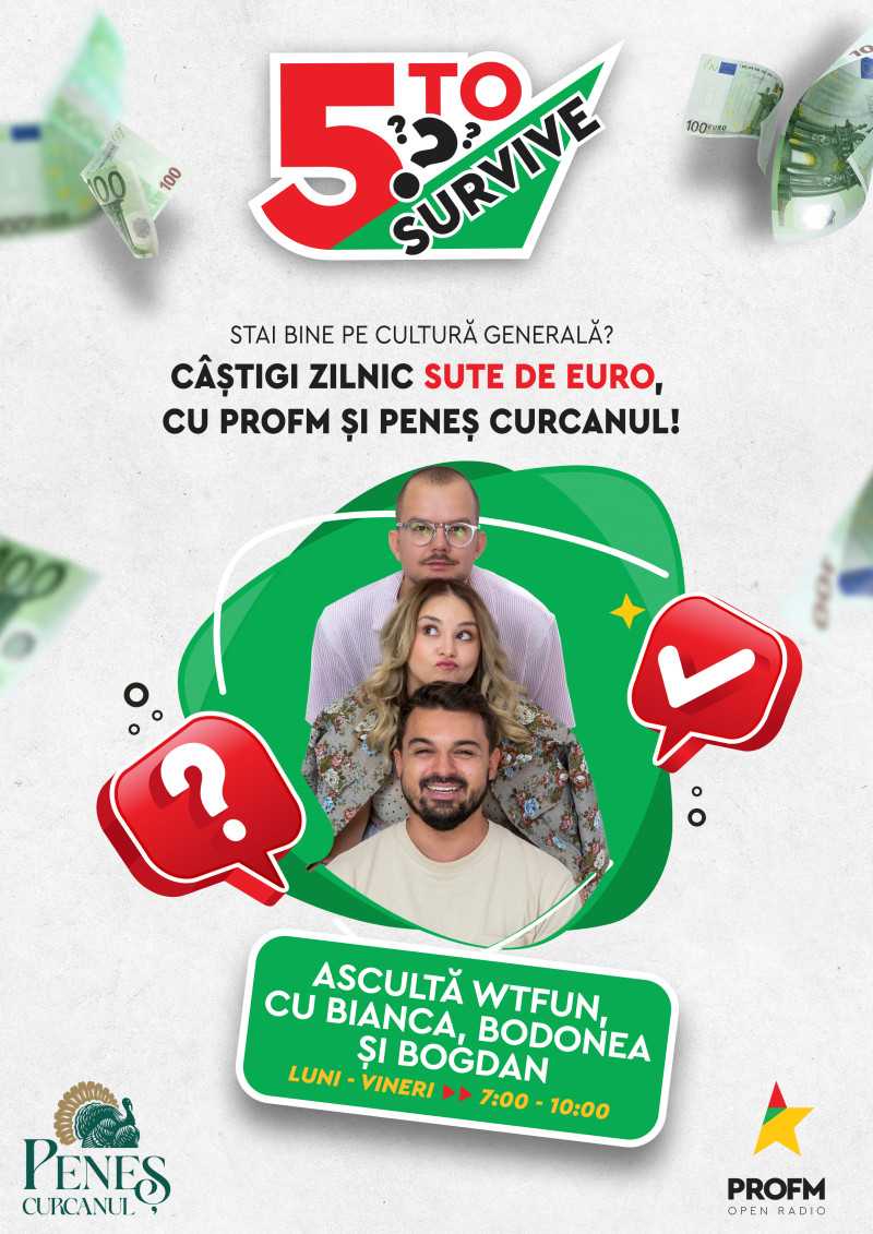 De luni până vineri, la WTFun, PROFM și Peneș Curcanul te premiază cu sute, chiar mii de euro la 5 TO SURVIVE! Ascultă What The Fun, cu Bianca, Bodonea și Bogdan și înscrie-te la concurs!