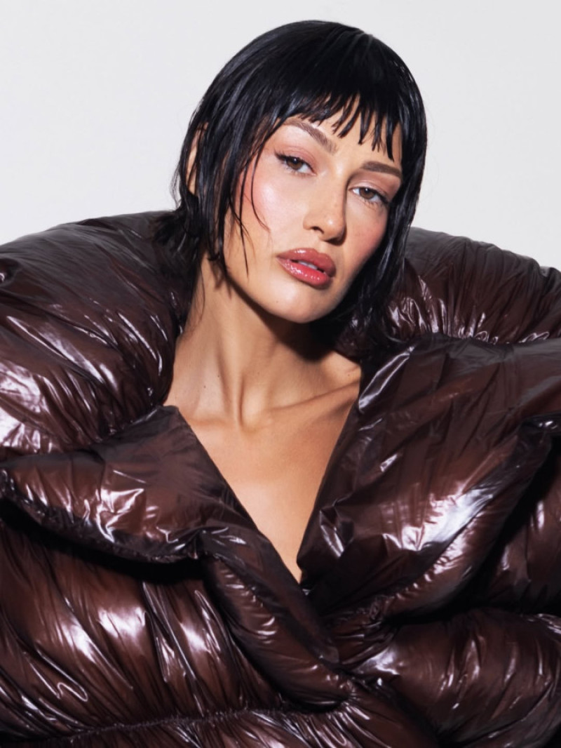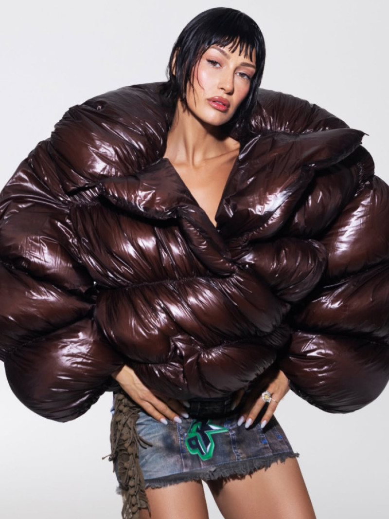 Întregul look a fost completat și de o ținută atipică, cântăreața purtând o jachetă voluminoasă, cu un design futurist, lucios, într-o nuanță intensă de ciocolatiu metalic, o fustă mini din denim și o pereche de sandale aurii care îi ajungeau până la genunchi.