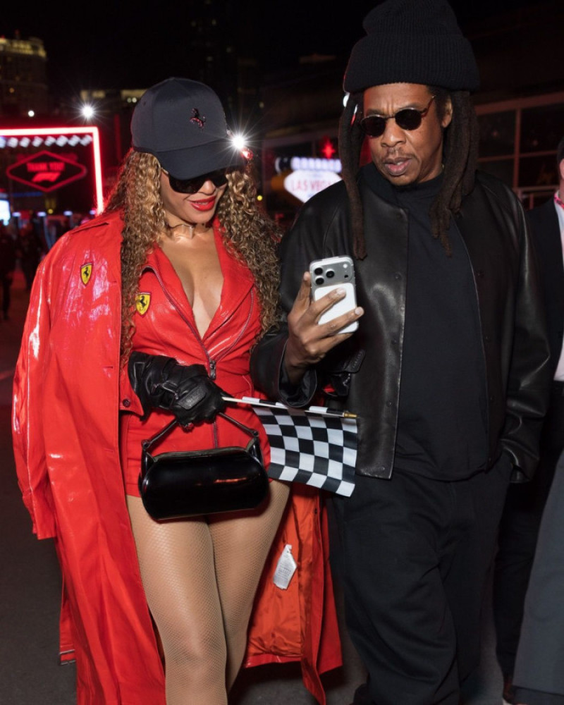 Artista a sosit la brațul soțului ei, Jay-Z, care a mizat pe un outfit all-black, cu pantaloni și cămașă neagră, peste care a purtat o jachetă de piele, plus o pereche de ochelari de soare. Cuplul a fost surprins atât la sosire, cât și plimbându-se prin paddock, zâmbind și interacționând cu organizatorii și invitații.
