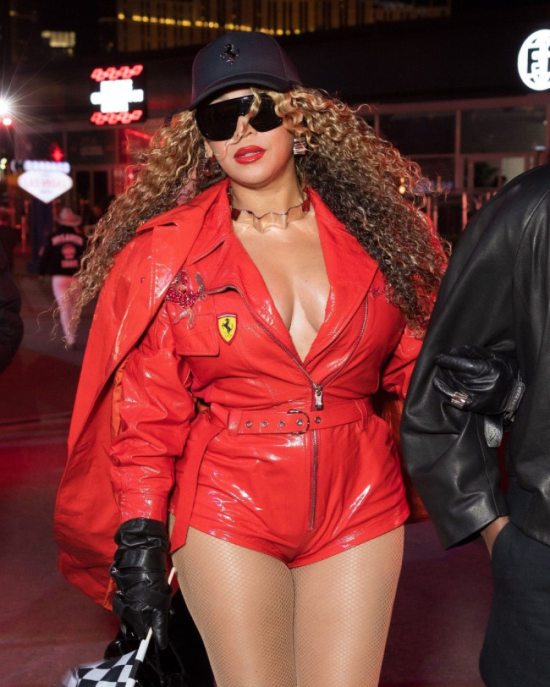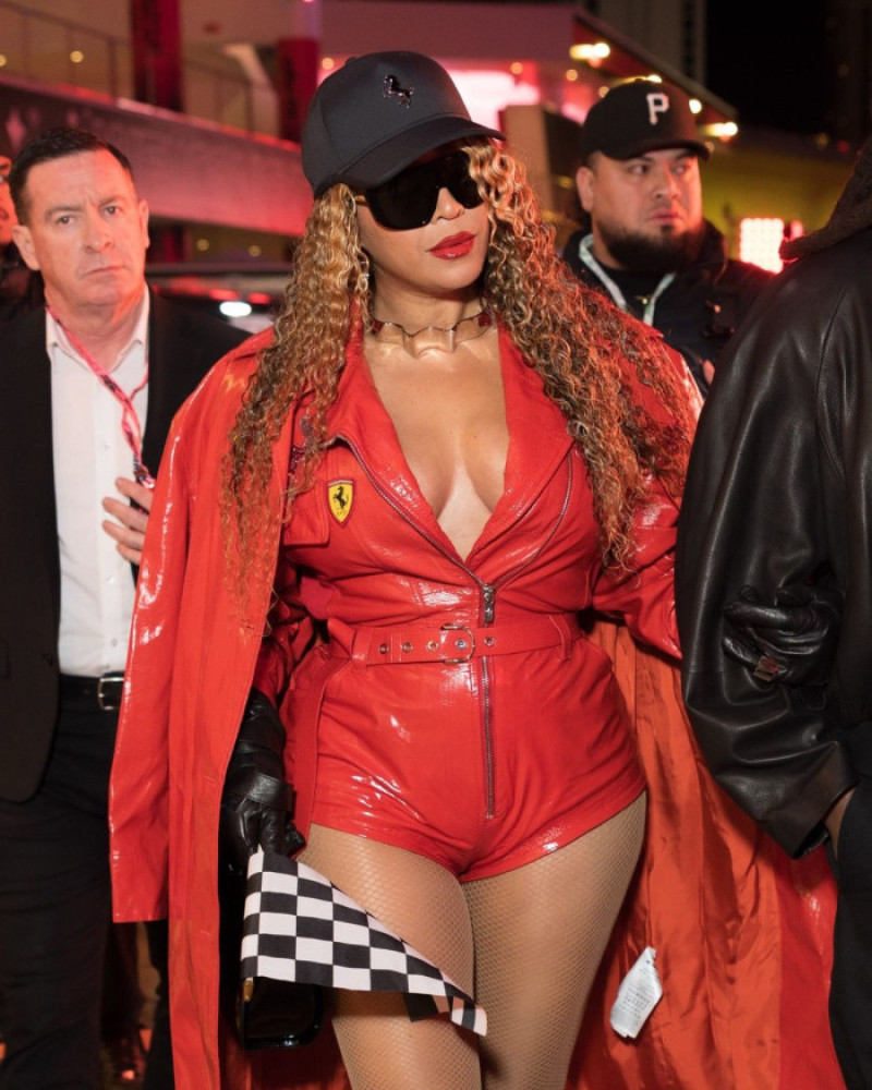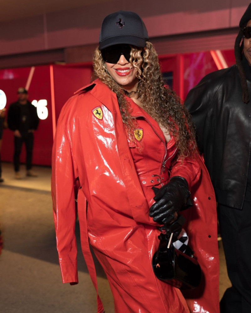 Într-o altă apariție spectaculoasă din timpul weekendului, Beyonce a fost surprinsă purtând un outfit complet roșu, inspirat din universul Ferrari, care a atras imediat atenția fotografilor. Artista a îmbrăcat un combinezon scurt, din latex lucios, cu fermoar adânc și curea în talie, peste care a purtat un palton lung, roșu intens, perfect asortat. A accesorizat look-ul cu mănuși negre, o geantă mini neagră, o șapcă cu logo Ferrari și ochelari de soare supradimensionați, completând astfel una dintre cele mai îndrăznețe și tematice ținute ale weekendului.