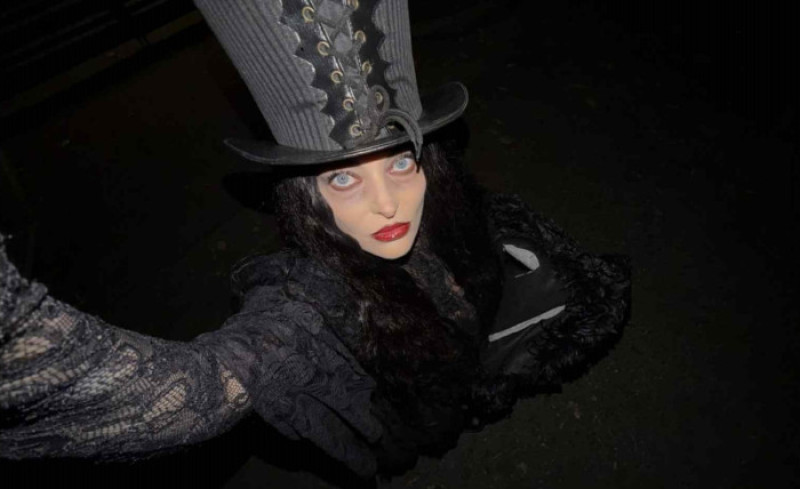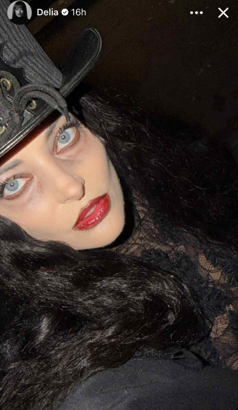 Cu o pălărie înaltă, ținută complet neagră din dantelă, dresuri plasă și botine cu platformă și toc înalt, Delia a oferit o interpretare modernă a eleganței "întunecate", într-un personaj perfect încadrat în atmosfera de Halloween.