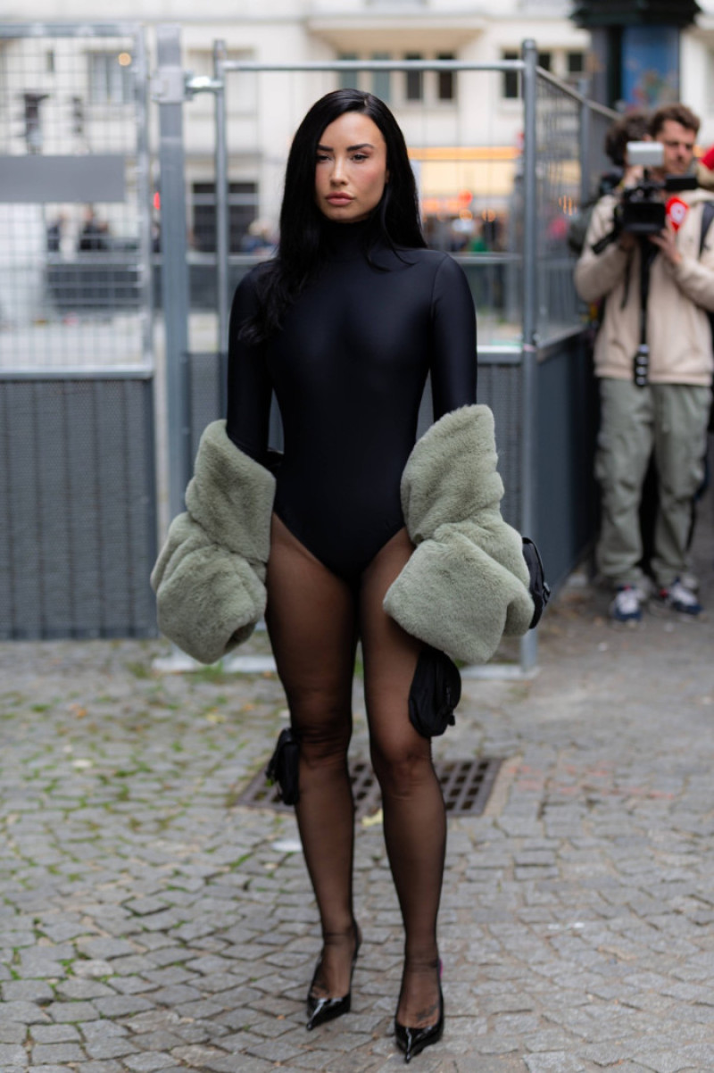Pentru apariția sa, artista a ales un look care a furat privirile și blițurile aparatelor foto: un body negru mulat, cu mâneci lungi și guler înalt, care îi contura perfect silueta. Lovato a combinat piesa cu dresuri transparente cu două buzunare atașate și un accesoriu din blană artificială verde-salvie, purtat nonșalant pe brațe.
