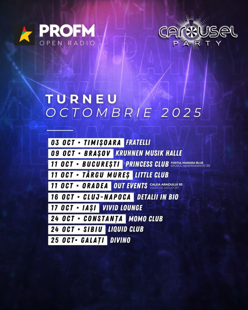 Pregătește-te pentru o experiență unică pe ringul de dans! Carousel Party, singurul party din România la care tu alegi muzica, ajunge în mai multe orașe din țară în luna octombrie, iar PROFM este partener oficial al evenimentului.