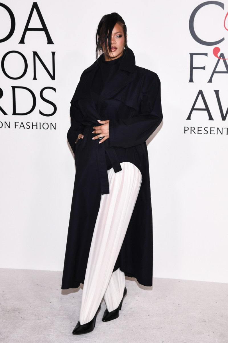 Rihanna a făcut furori într-un trench negru, prins cu un cordon în talie, pe care l-a completat cu o pereche de pantaloni albi și botine negre. Ținuta a fost descrisă chiar de ea ca fiind „un look postpartum, atemporal și fără efort”.