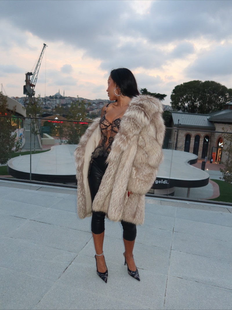 În plus, artista a completat ținuta cu o haină din blană, purtată lejer pe umeri, care a adăugat un plus la factorul wow. Mixul dintre blana voluminoasă și piesele ultra-mulate au oferit un contrast seducător.