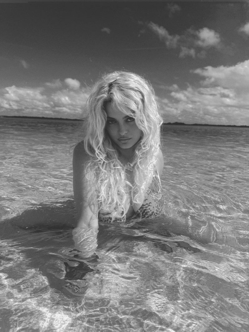 În cadrele de aproape, Bebe Rexha își etalează machiajul impecabil. Părul blond este prins într-un coc lejer, decorat cu accesorii delicate, argintii, care adaugă o notă jucăușă și strălucitoare. Ținuta este completată de un colier cu strasuri, personalizat cu numele „Bebe”, un detaliu care atrage toate privirile.