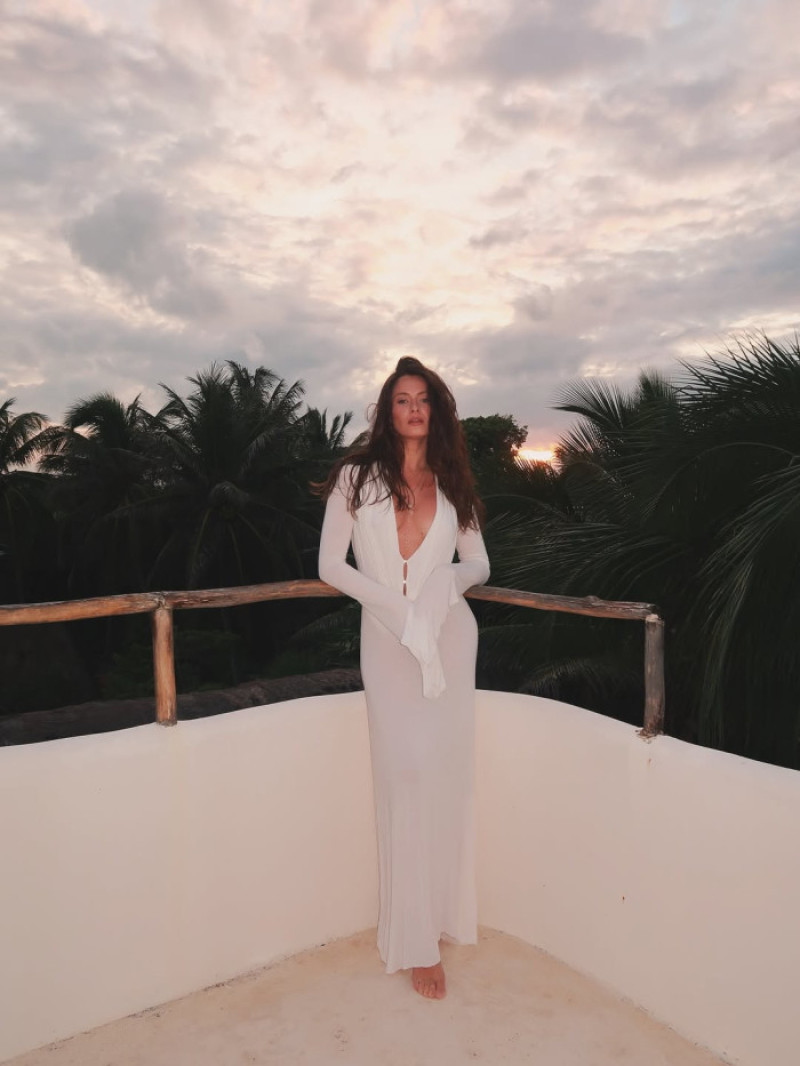 În fotografii, Raluka pare să se bucure de fiecare clipă: se joacă cu camera, își lasă părul să cadă dezordonat în lumina caldă a soarelui și pozează cu aerul unei femei care se simte bine în pielea ei. Iar rochia albă, vaporoasă, purtată la apus, completează perfect vibe-ul boem și sofisticat al aniversării.
