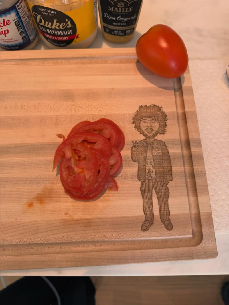 Un alt detaliu care a devenit rapid viral este un tocător personalizat, gravat cu imaginea lui Benny Blanco, dar și o fotografie în care artista își etalează discret inelul de logodnă, ținându-și mâna pe pieptul soțului ei.
