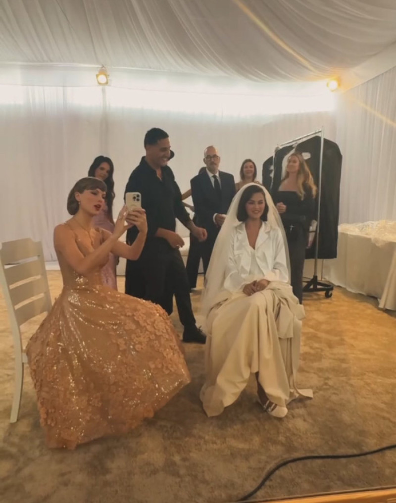 În videoclipul postat, Gomez apare în camera unde se pregătea pentru ceremonie, purtând o rochie albă vaporoasă și un voal delicat. Alături de ea, Taylor Swift, îmbrăcată într-o rochie cu aplicații florale strălucitoare, o filmează cu telefonul, complet vrăjită de prietena sa.