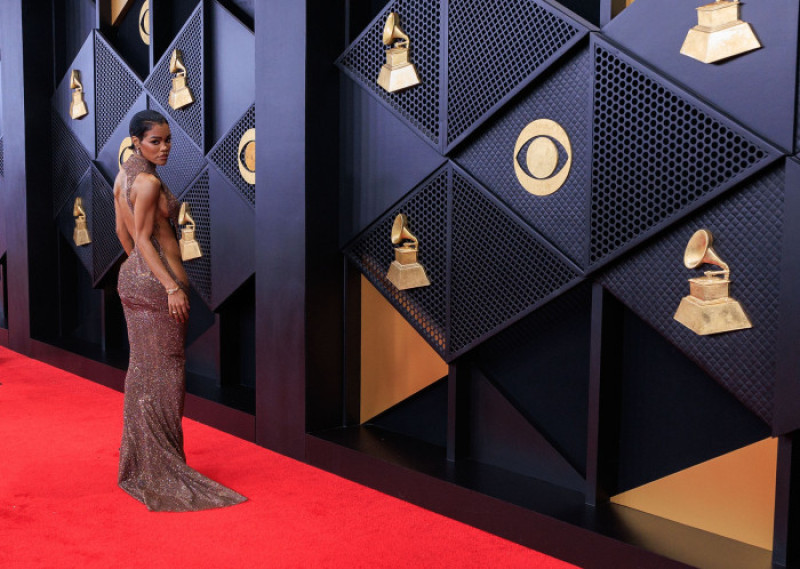 Privită din spate, rochia a fost la fel de spectaculoasă, punând în evidență umerii puternici, musculatura bine definită a spatelui și tatuajele elaborate ale artistei. Teyana și-a purtat părul într-un wet look care a accentuat și mai mult impactul. Machiajul luminos, pielea strălucitoare și buzele lucioase au completat apariția de efect.