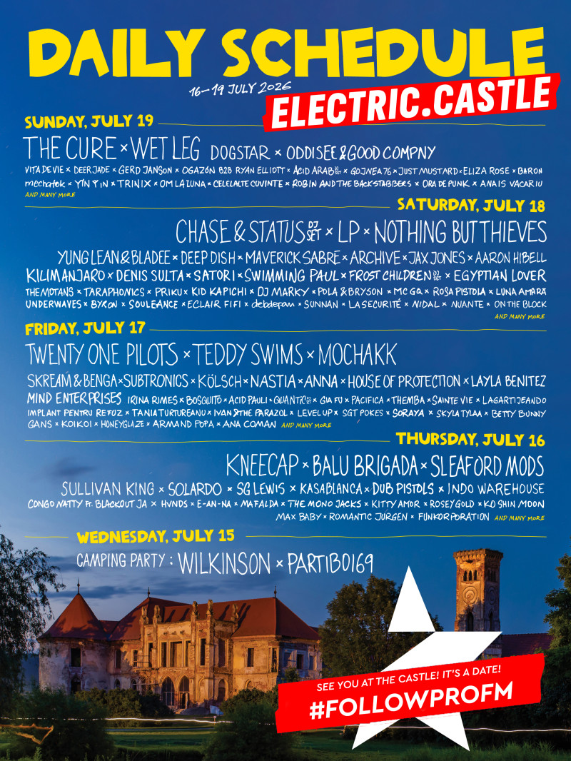 Între 16 și 19 iulie, pe domeniul Banffy din Bonțida, Electric Castle vine cu seri foarte bine desenate: vineri - Teddy Swims, Twenty one Pilots și Mochakk, sambată - LP, Chase & Status și Nothing But Thieves iar duminică- The Cure și Wet Leg, două dintre cele mai așteptate apariții ale ediției.