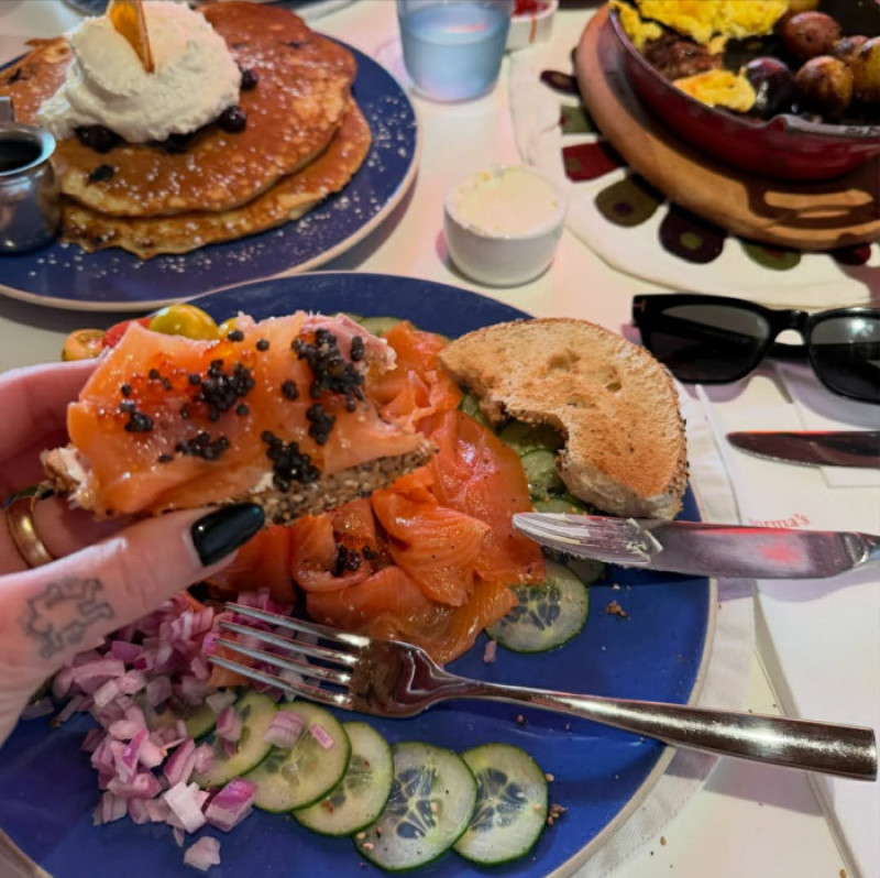 Într-una dintre imagini, iubita actorului Callum Turner afișează un fizic impecabil, într-un costum de baie minuscul, bleu, cu paiete strălucitoare, lăsându-și la vedere tatuajele. Pozele cu preparatele delicioase pe care le-a încercat, dar și cele în care apare într-o superbă rochie albastră, extrem de decoltată au strâns de asemenea numeroase like-uri din partea fanilor.